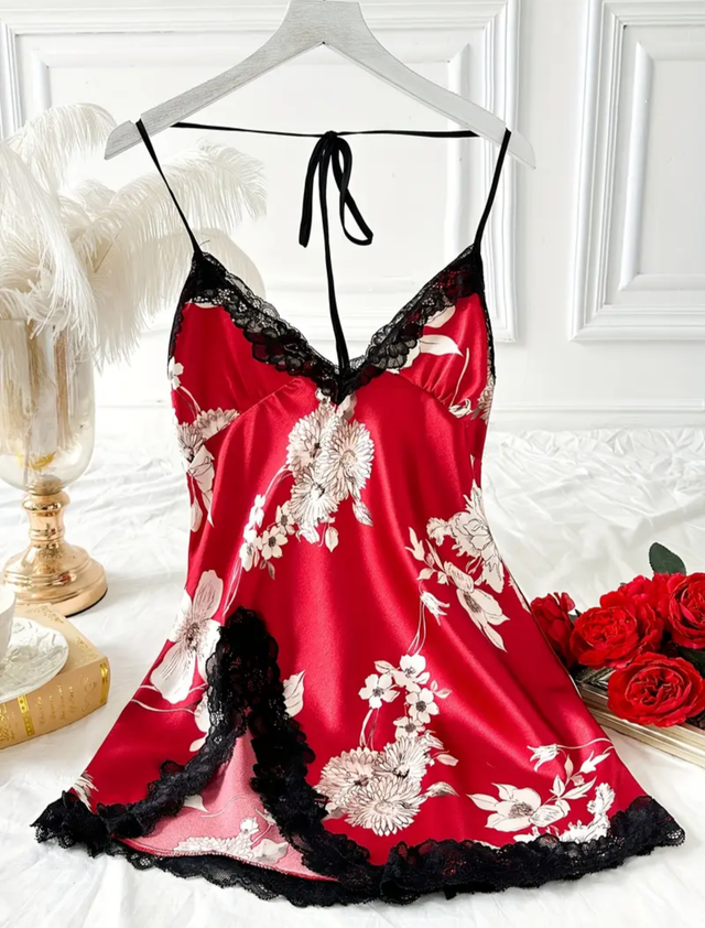 Kobieca Seksowna Czerwono-Czarna Koszula Nocna z Koronką i Dekoltem w Serek, Odkryte Plecy , Regulowane Ramiączka